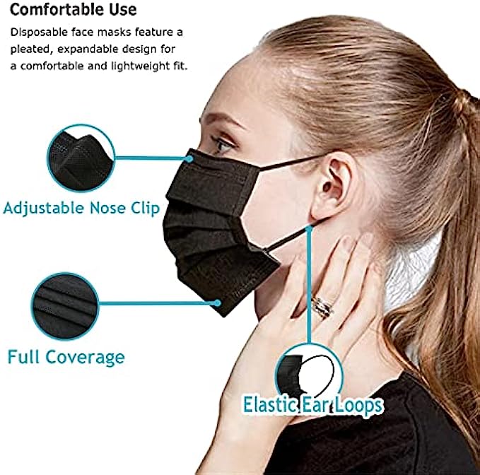 • Black Disposable Face Masks - Masks are made from 3 layers of soft and breathable non-woven fabric. These disposable face masks feature a pleated, expandable design for a comfortable and lightweight fit.