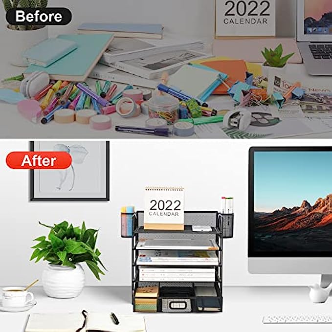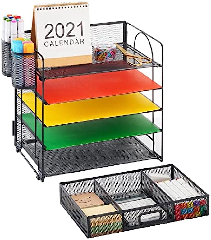 • 【Perfect Desktop File Organizer】Our Office Desk Supplies Organizer is made of 5 sliding trays + 2 Hanging Pencil Holders + 1 sliding drawer which has enough storage space to accommodate all office supplies, such as pens, pencils scissors, folders and Letter/A4 Size Paper.