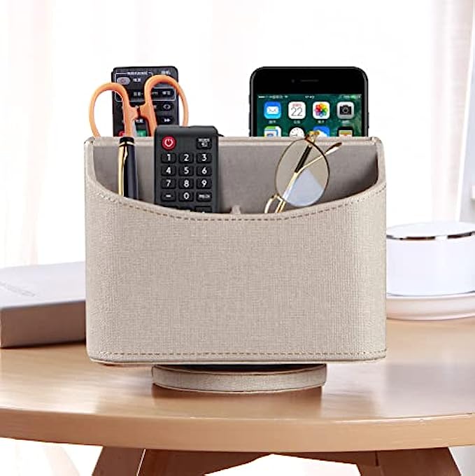 PUSU Leather 360°Rotatable Remote Control Holder,Nightstand TV Remote Caddy,Office Supplies Desktop Organizer,Spinning Storage Box for Pen,Mail,Phone,DVD, Blu-Ray, Media Player, Heater Controllers