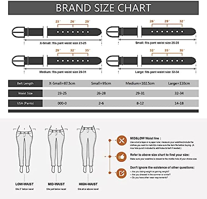 [ Belts Size ] Womens belt in XS/S/M/L size, belt wide 1 1/10", please measure your waistline(include the clothes you want to match)to make sure the item fits before buying (Our size chart is different from Amazon, please check it more careful)