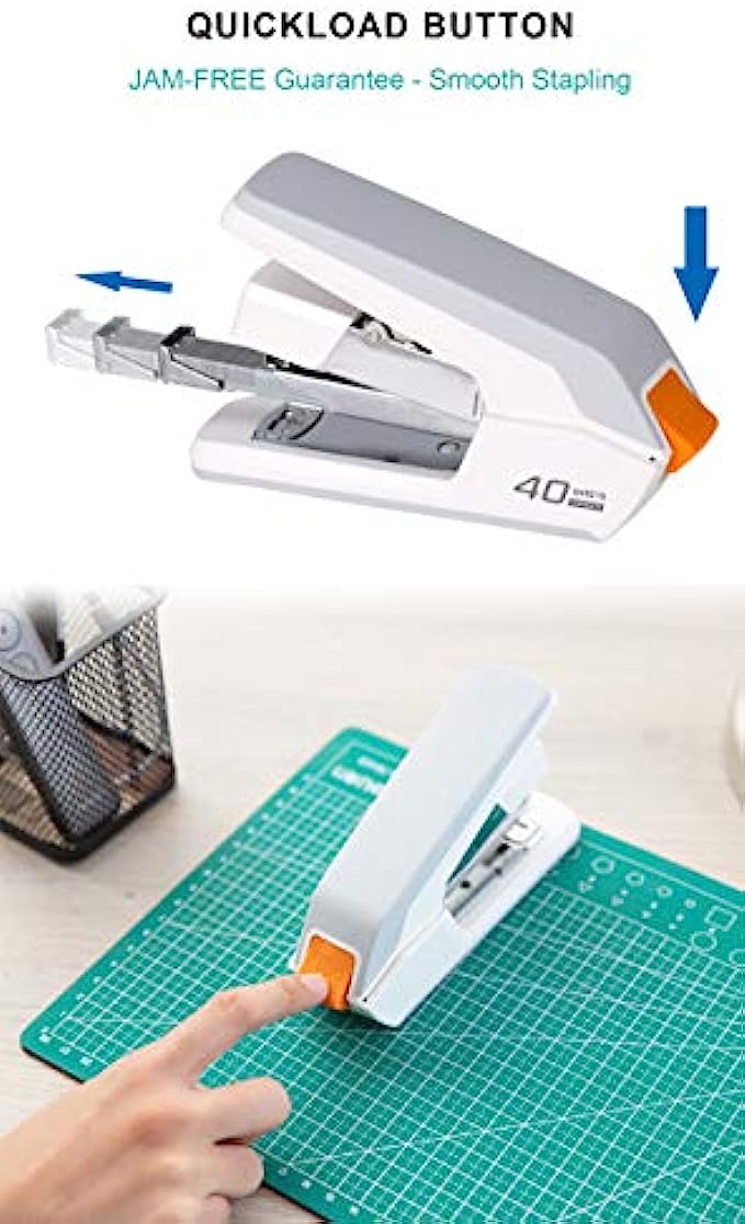 Deli Effortless Desktop Stapler, 40-50 Sheet Capacity, One Finger Touch Stapling, Easy to Load Ergonomic Heavy Duty Stapler, Includes 1500 Staples and Staple Remover