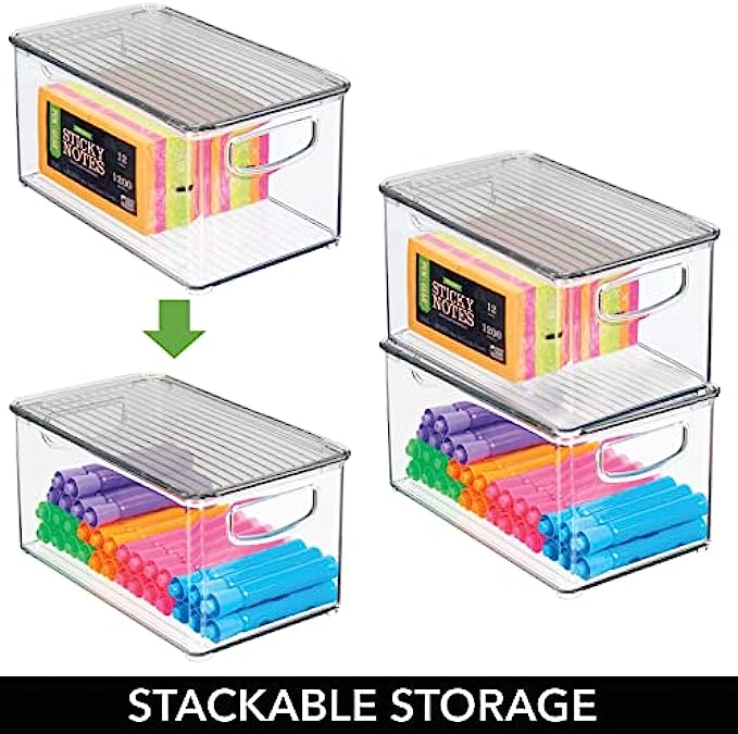 • PORTABLE & LID: Create space-saving storage in closets, shelves, cabinets, cupboards or on your work surface; Portable to move from room-to-room; Clear view so you can easily find what you are looking for without opening the bins; Keep items contained, organized and dust-free; Perfect for storing extra office supplies like staples, highlighters, paper clips, binder clips, staplers, notepads, sticky notes, washi tape, glue sticks, rubber cement and more; Set of 4